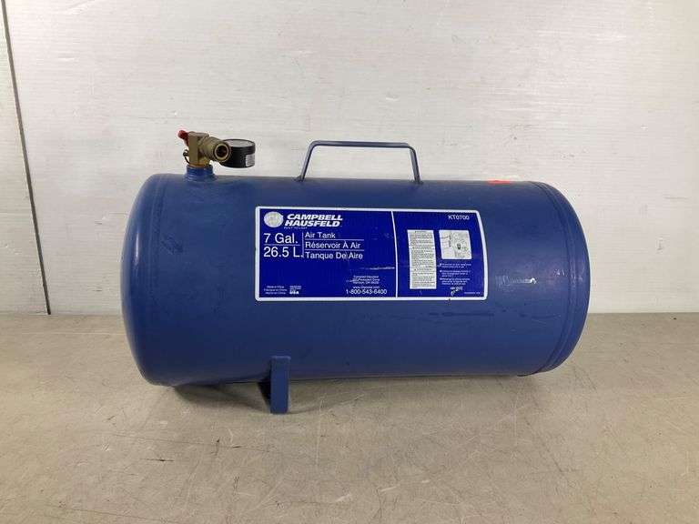 Campbell Hausfeld air tank with a 7-gallon (26.5 L) capacity, model KT0700. Features include a pressure gauge, a brass valve, a red shutoff handle, and a carrying handle. The tank is blue and cylindrical in shape, with a stable base for support.