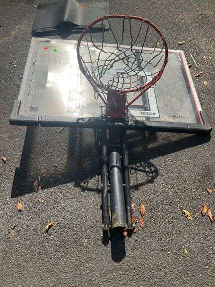 Basketball hoop with a transparent backboard and red metal rim attached to an adjustable black pole. Includes netting on the hoop and various visible wear from prior use. Backboard features Elite branding. There is no bottom pole or base with this unit.