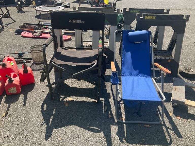 Folding outdoor chairs, one branded Gander Mountain with black fabric and mesh pockets, the other featuring a blue fabric seat, wooden armrests, and an adjustable backrest with headrest. Both have metal frames and portable designs.