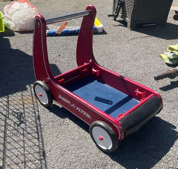 Radio Flyer red wagon walker featuring a metal handle, plastic body, and rubber wheels with white plastic hubs. The design includes a blue flat surface inside the wagon and black detailing at the front.