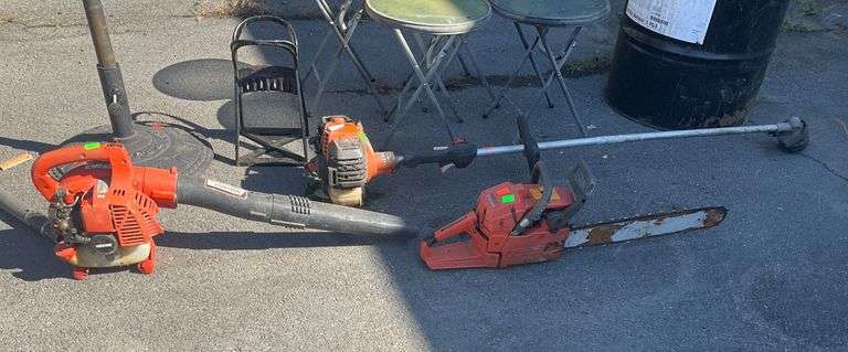Outdoor power equipment consisting of a chainsaw with attached bar and chain, a handheld leaf blower, and a gas-powered string trimmer. Items display visible wear and usage signs. Specific brands visible on items include Husqvarna and others.