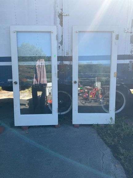 Two glass-paneled doors with white painted frames, each measuring 80 inches by 36 inches. Each door includes pre-installed door hardware, including handles and hinges. Visible wear on paint surface from prior use.