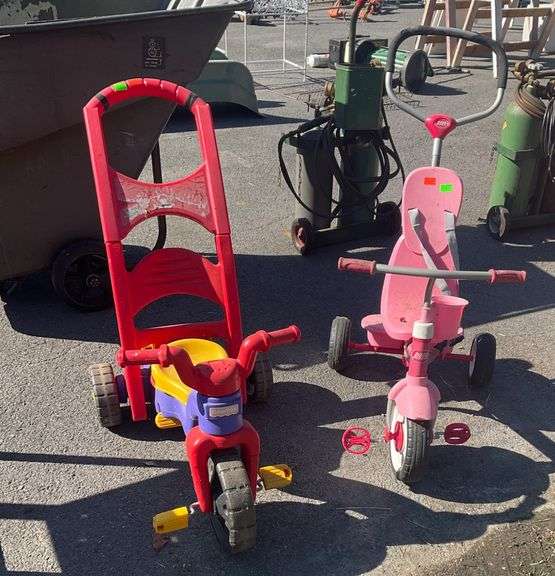 Two kids bikes including a red and yellow push-behind bike by Fisher-Price and a pink push-behind tricycle by Radio Flyer. Both items exhibit damage as visible in the provided images.