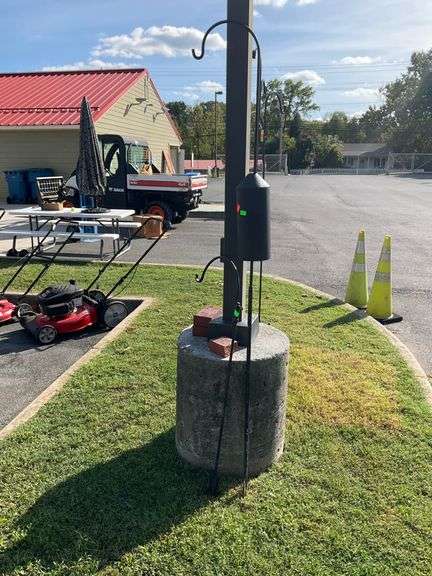 Shepherd hook featuring a squirrel guard and mountable plant holder. Includes components measuring 84 inches and 45 inches in height. Designed for outdoor use with secure mounting capabilities.
