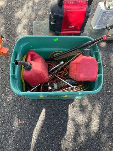 Tow straps, ropes, and cables contained in a green plastic bin, along with two red plastic fuel containers. Includes a range of automotive and utility accessories, as shown. All items appear used, with wear visible.