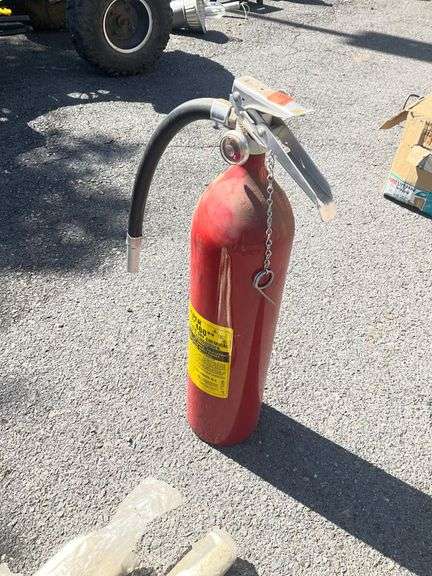 Fire extinguisher featuring a red metal body, attached hose, and pressure gauge indicating recharge and overcharge levels. Includes a labeled front panel with handling instructions and chain-linked safety pin. The item is not charged.