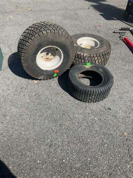 Three tires, including mounted and unmounted types. Visible specifications include 20x8.00-8 NHS and 16x6.50-8 markings. Two tires are mounted on steel rims. Suitable for outdoor or heavy-duty applications as indicated by tread design. All tires have some signs of dry rot and prior use. This is sold as-is condition.