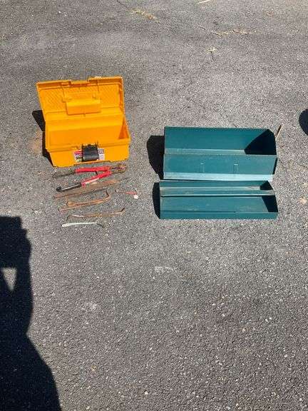 Includes a yellow plastic toolbox and a green metal toolbox, each with trays. The lot features assorted hand tools, as shown. Tools display varying levels of wear and use.