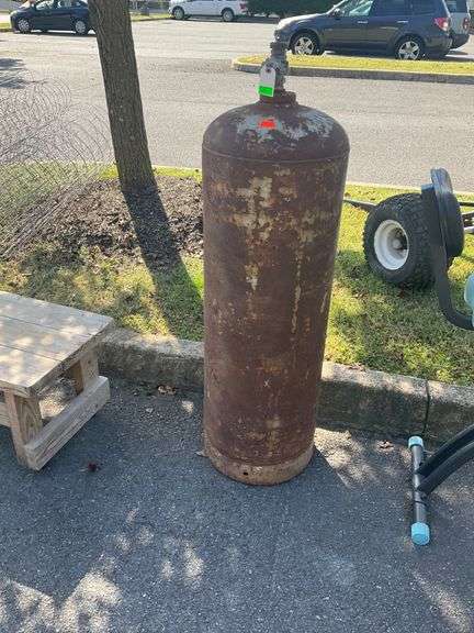 Metal cylinder measuring 48 inches in height featuring a valve fixture at the top. The surface shows visible rust and wear. Includes a tag with lot identification information. Likely designed for industrial use or storage of specific contents. The tank is empty.