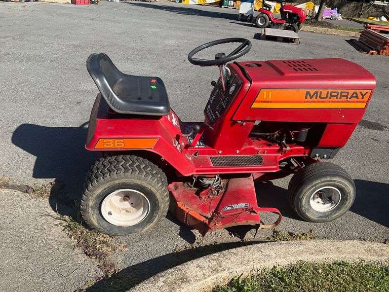 Murray riding lawn mower featuring an 11HP Briggs & Stratton Synchro-Balanced engine and 6-speed transmission. Includes a Transaxle system. Red finish with manufacturer labeling visible. This item will need work for full functional capabilities.