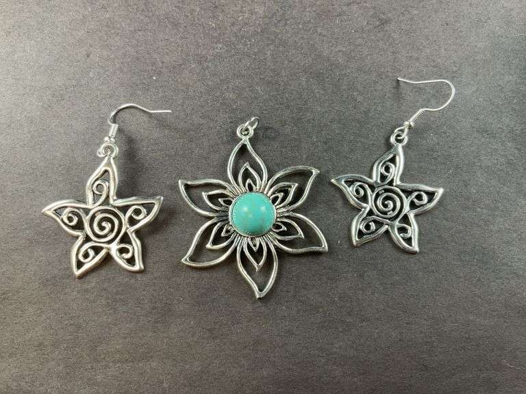 LOT 686 - Hollow carved flower silvertone pendant and dangle earrings