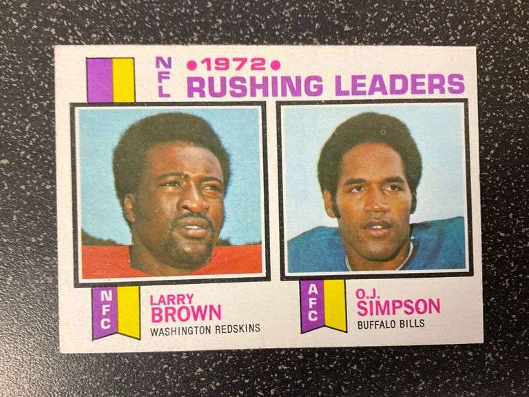 1973 Topps trading card highlighting the 1972 NFL rushing leaders, Larry Brown (Washington Redskins) and O.J. Simpson (Buffalo Bills). Features player images and statistics from both NFC and AFC categories. Printed in the USA by T.C.G.