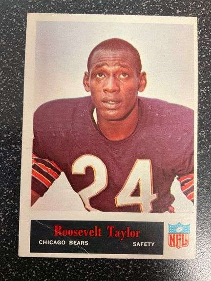 A 1965 Philadelphia football trading card featuring Roosevelt Taylor, Safety for the Chicago Bears. Includes stats and details on the reverse side. The card bears the number 25 within the series.