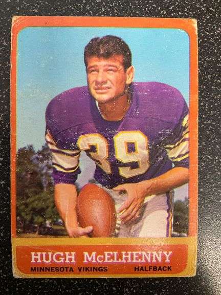 1963 Topps football trading card featuring Hugh McElhenny of the Minnesota Vikings. Card is numbered #103 and includes player information, stats, and trivia printed on the reverse. Printed in the USA.