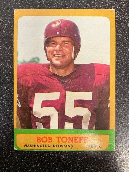 1963 Topps Bob Toneff football card #165 featuring the Washington Redskins tackle. Includes player details such as height, weight, college, and years played, along with a trivia question. Printed in the USA.