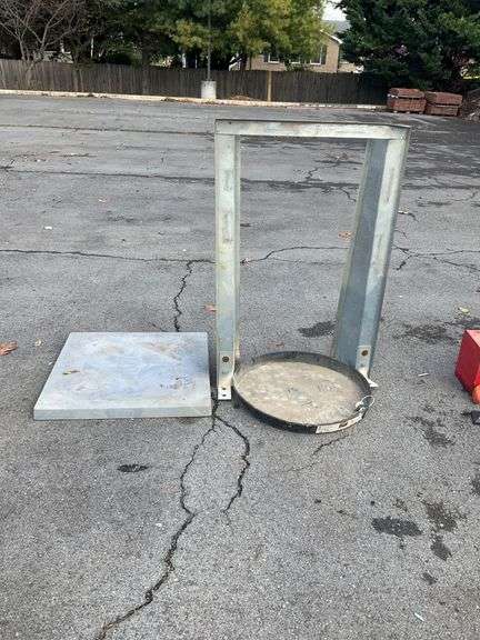 A water heater pan, a circular AC pan, and an aluminum AC frame. The AC frame features mounting holes, and the pans are designed for containment purposes. Items show visible wear from prior use.