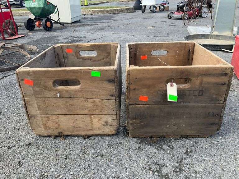 Open-top wooden crates featuring handle cutouts on opposing sides. Constructed with slatted panels, offering a functional design. Visible wear and patina indicative of prior use. Suitable for versatile storage or display applications.