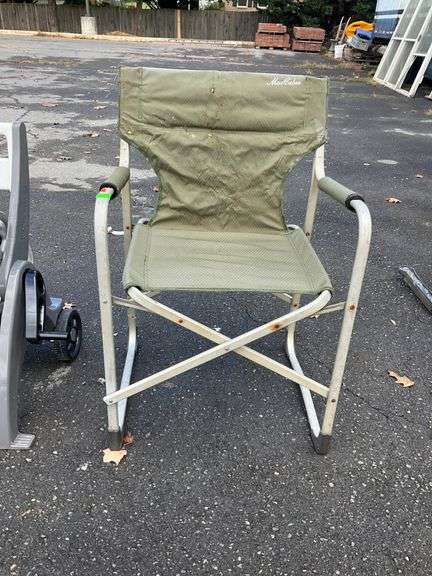 Macabee folding outdoor chair featuring an aluminum frame with a green fabric seat and backrest. Includes armrests with padded covering. The chair is lightweight and collapsible for portability. Visible surface wear present on the frame and fabric.