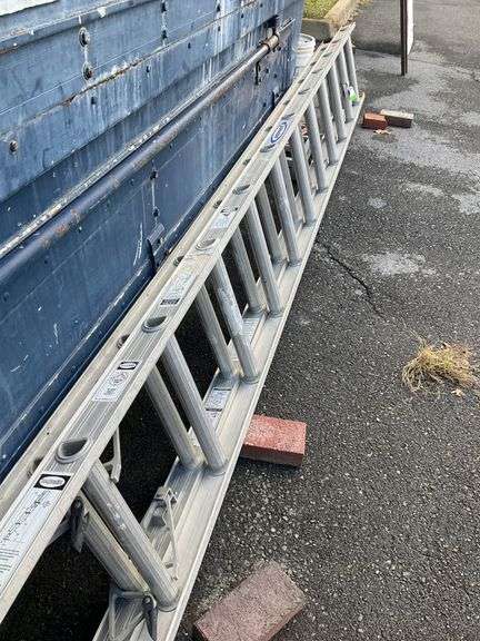Werner 28-foot extension ladder made from aluminum. Features a durable design with two sections and safety locks. Includes visible Werner branding on the side rail. Rust visible on specific components.