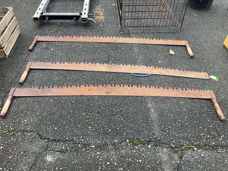 Three 64-inch two-man crosscut saws featuring metal blades with large teeth and wooden handles on each end. Designed for two-person operation, these saws are suitable for heavy-duty cutting tasks. Visible surface wear on the blades and handles is evident. One of the saws is missing a handle.