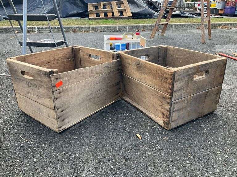 Rectangular storage crates constructed of wood, featuring cutout handles on each side for carrying. The visible surfaces display horizontal plank construction, with natural wood grain and finish apparent.