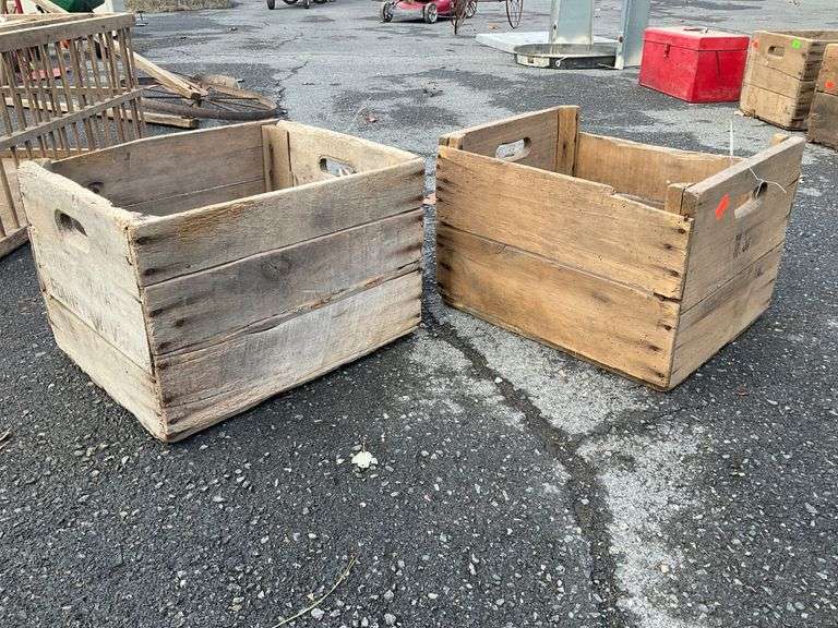 Two wooden crates featuring hand-cut handles on each side. Both items show visible markings and Both items show visible slats, aged textures, and functional design for storage or display. One of the slats is damaged on the bottom.