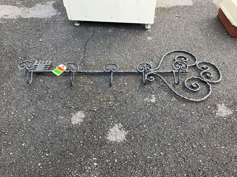 Metal coat and hat rack designed in the shape of a key, featuring five evenly spaced hooks for hanging items. The piece measures 44 inches in length and showcases intricate scrollwork details on the key's design.