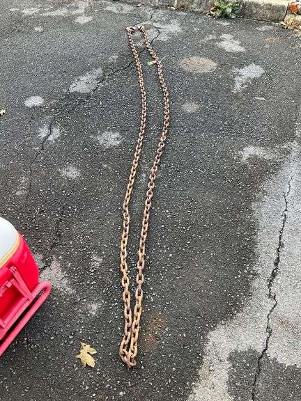 Metal chain measuring 20 feet in length, featuring hooks at each end. The chain appears to have a rusted surface and is suitable for various applications requiring length and strength. Hook design allows for secure attachment.