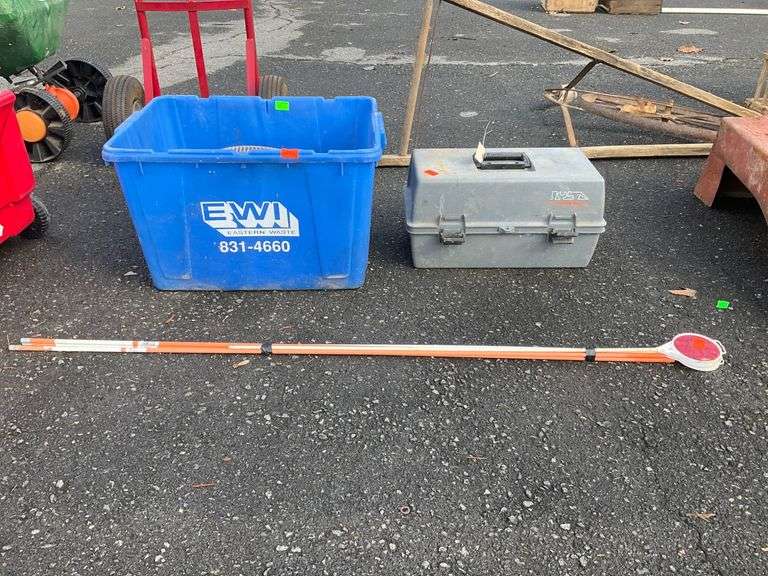 Includes multiple reflective ground stakes, a plastic toolbox containing various tools such as drill bits, and a bin with components for a hose line, including flexible tubing and metal fittings.