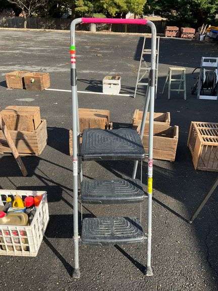 Lightweight three-step folding ladder featuring a 28-inch height from the ground to the top step. Constructed with a metal frame and textured plastic steps for stability.