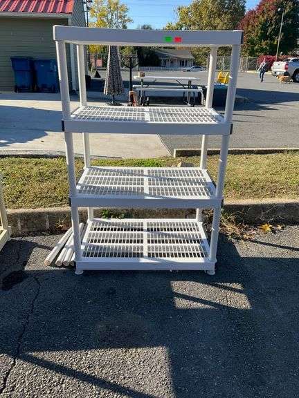 Four-tier vented shelf unit featuring white vented shelves supported by uprights. Includes four additional uprights for potential customization or replacement. Measures 55 inches tall by 36 inches wide and 24 inches deep. Constructed from durable plastic.