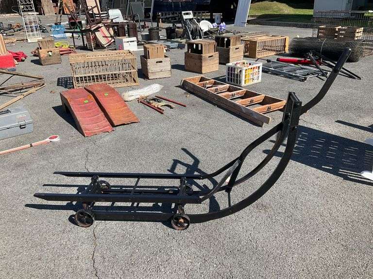 Freight or hand truck marked 'Arcade Jack' with additional branding that is partly illegible. Features a steel frame, four wheels, and dual handles with a curved design. Constructed with durability for transporting heavy loads. Black finish throughout.