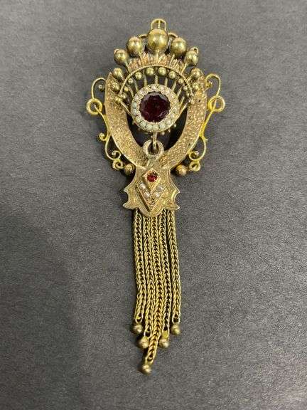Ornate gold-tone brooch featuring a central red stone surrounded by pearl accents and a crown-like design. Includes chain tassels and intricate filigree details. Pin closure on the reverse with visible functional components.