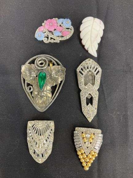 Six mixed-metal dress clips featuring rhinestones, enamel floral detailing, and one carved leaf-shaped piece. Some clips display intricate geometric patterns.