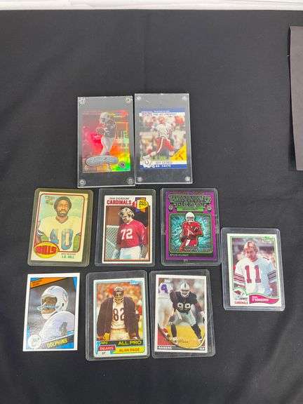 9 football trading cards from different brands showcasing various players, including Alan Page, Rob Moore, Kyler Murray, and Neil O'Donoghue. Cards are protected in sleeves and cases, and some feature specialty designs such as holographic effects.