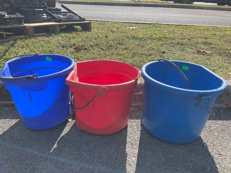 Two feed buckets, one red and one blue, both with measurement markings on the interior, and one blue electric heated water bucket equipped with a heating coil and a cord. Items show visible signs of use. Electrical water heater, is non tested by Hash Auctions.