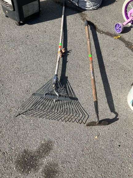 Includes a leaf rake with metal tines and a garden hoe featuring a flat blade. Both tools have long wooden handles. Suitable for various garden and yard maintenance tasks. Visible wear is consistent with prior use.