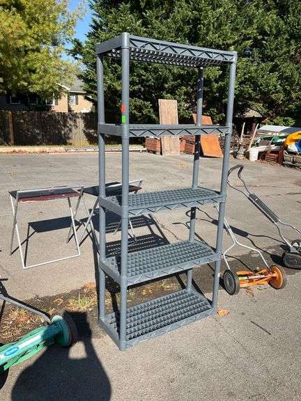 Gray five-tier vented shelf unit by Plano. Features durable construction with open shelves to facilitate airflow. Dimensions are 75 inches high, 34 inches wide, and 14 inches deep. Suitable for organizing various items in indoor or outdoor settings.