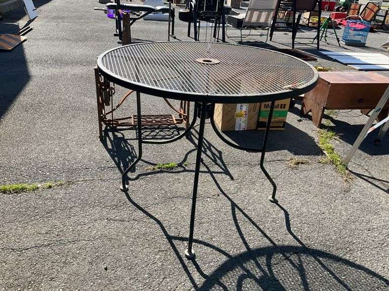 Round metal mesh table featuring a 36-inch diameter top with a central opening suitable for an umbrella. Supported by scrolled legs for added stability and design. Made of durable metal construction.