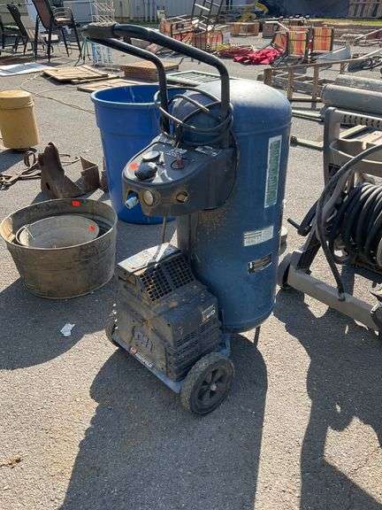 Campbell Hausfeld portable air compressor with a maximum pressure of 200 PSI. Features a pressure gauge, control panel, and two rear wheels for mobility. Due to its condition, it is being sold for parts to harvest or for repairs.