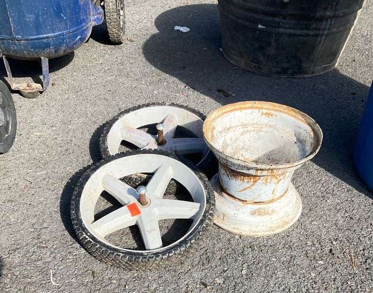 Two mower tires featuring treaded surfaces and a separate four-lug wheel rim. The tires display a star-shaped spoke design, while the wheel rim shows a manufactured metal construction with four bolt holes.