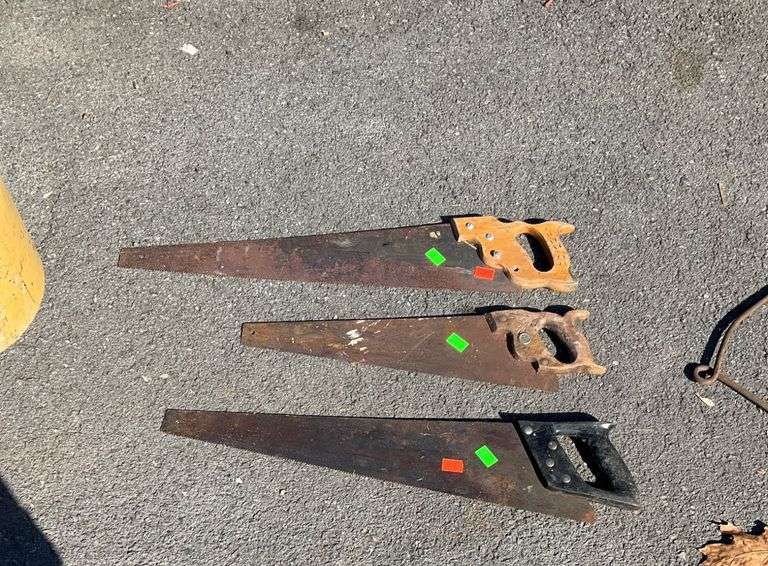 Three metal hand saws, each featuring a distinct handle design. Two saws have wooden handles with a cut-out grip, while one has a black plastic handle. The blades show signs of wear and use, with visible oxidation.