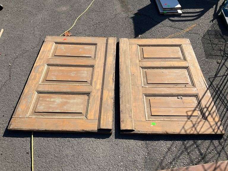 Pair of Three-panel doors featuring rectangular recessed panels on each door. Each door measures 47 inches by 32 inches. Constructed with visible panel framework and displaying a natural finish.