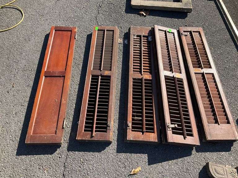 Five bi-fold shutters featuring a slatted design on one side and paneled backs. Individual dimensions are 38 inches high by 8 inches wide, extending to 16 inches in width when opened. Functional hinges included.