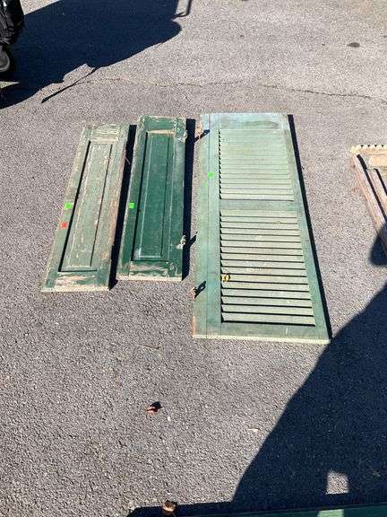 One louvered shutter measuring 56”x19” and two 1-panel shutters measuring 43”x9”. Green finish with visible wear. Suitable for decorative or architectural purposes.