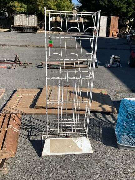 Metal wire rack featuring three tiers for storage or display. Constructed with a sturdy metal frame and supported by a weighted base for stability. Measures 50 inches in height, 16 inches in width, and 10 inches in depth.