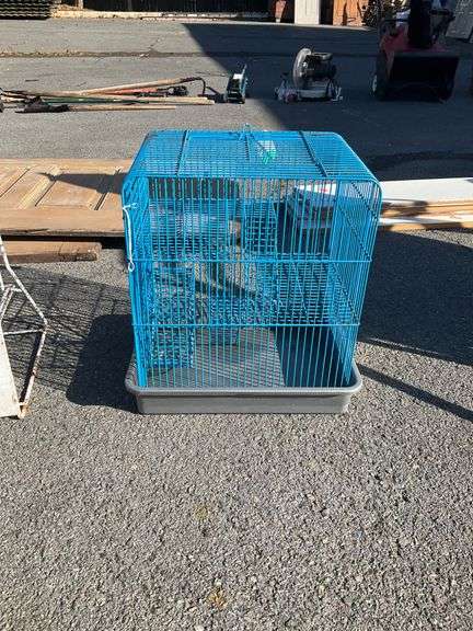 Blue wire birdcage featuring a rectangular shape and a removable plastic base for easy cleaning. Includes interior perches and a swing. The dimensions are 14”x11”x18”.