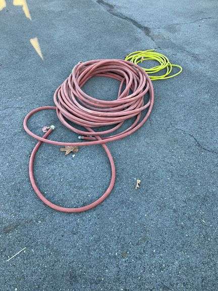 Two sets of heavy duty hoses: one red and one yellow. The yellow hose is labeled with 3300 PSI/228 BAR maximum pressure and 140°F (60°C) maximum temperature. Both feature various fittings and attachments. Potential signs of use visible on attachments and ends. Both items have lot have been cut and repair will be needed for functional use if both items.