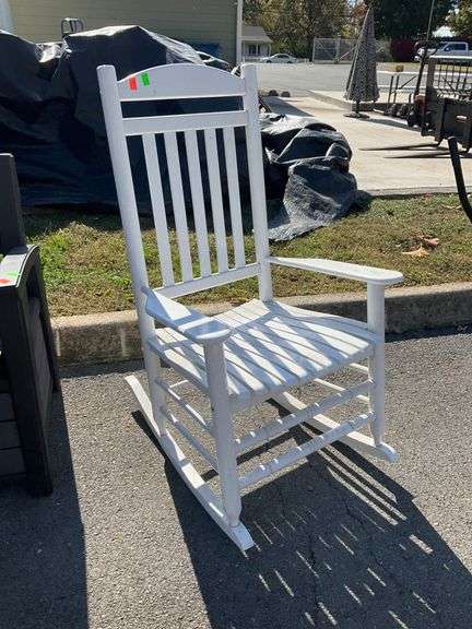 White slatted rocking chair by Hampton Bay featuring a high, slatted backrest and contoured seat. Includes flat armrests and curved runners for rocking motion. Constructed from materials designed for outdoor use. Manufacturer's name visible on metal plaque on back.
