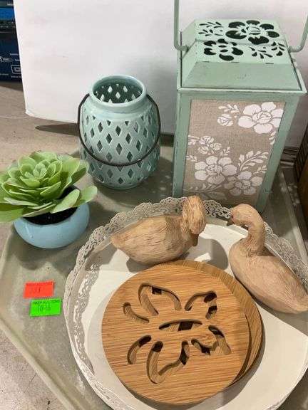 LOT 1016 - Home decor group, lanterns, trivets, everlasting succulent and more
